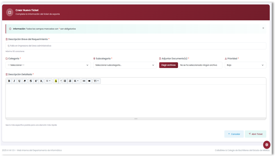 Es importante señalar que si abren un Ticket con referencia a un Informático también agregar el Número de Inventario, NIC o Número de Serie, este debe estar registrado en la plataforma W I D I para dar más agilidad al mismo.