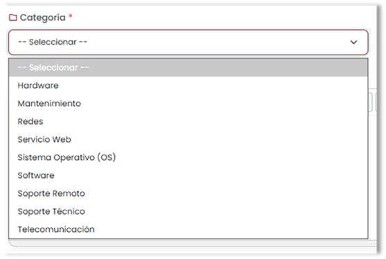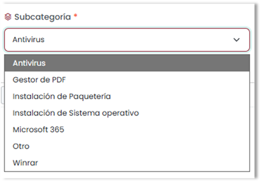 Subcategoría: Aquí seleccionará la opción de requerimiento de servicio que el usuario está solicitando.
