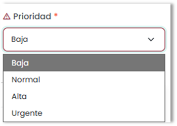 Prioridad: Aquí seleccionará que tan prioritario es su solicitud del Ticket MDA, podrá seleccionar entre BAJA, NORMAL, ALTA y URGENTE.