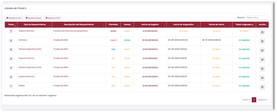 La séptima columna la fecha cuando finalizó o ce cerró el Ticket MDA.