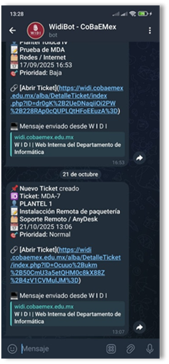 También podrá recibir una notificación vía Telegram, la notificación la recibirá cuando este registrado su Telegram ID en la opción de PERFIl dentro de W I D I.