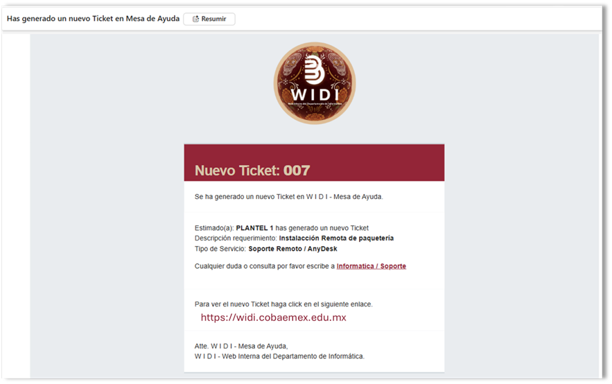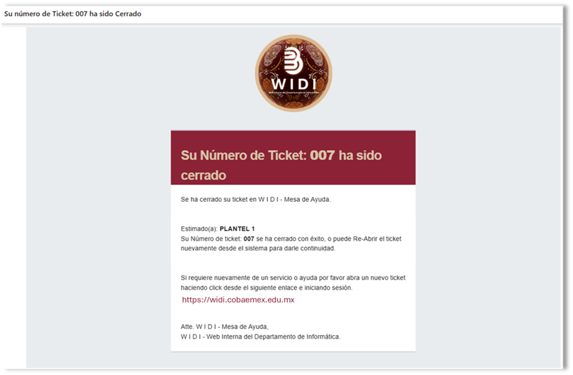 Si tienen alguna duda y/o cometario sobre el uso de Mesa de Ayuda en W I D I favor de comunicarse al Departamento de Informática o al correo informatica@cobaemex.edu.mx.