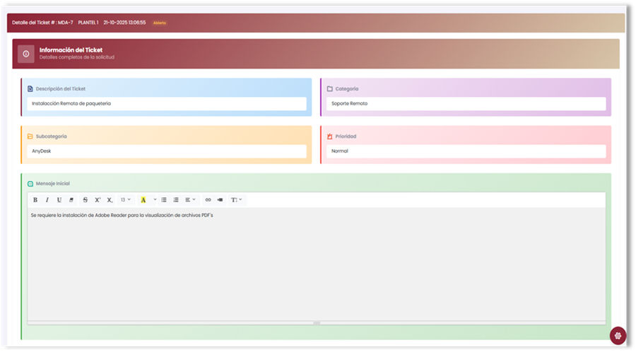 En esta pantalla mostrará el detalle del Ticket MDA creado o abierto, el número, el nombre de plantel, fecha en que se creó y el estado del Ticket.