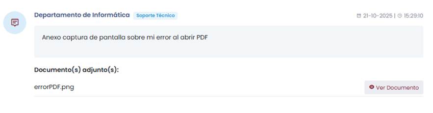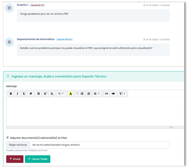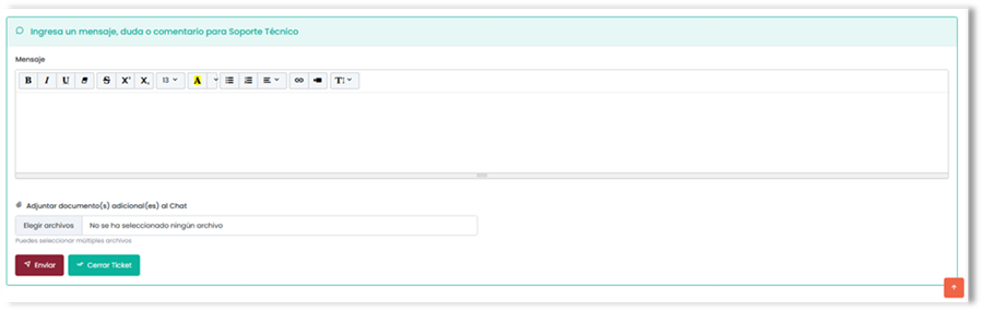 También podrá adjuntar al mensaje archivos para reforzar su solicitud de Ticket.