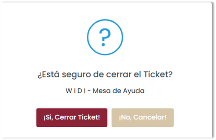 Al momento de dar clic al botón “Cerrar Ticket” se le preguntará si desea cerrar el Ticket MDA