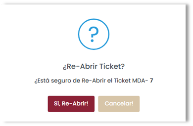 Si desea reabrir su ticket y no abrir un nuevo Ticket MDA solo deberá hace clic en la columna Estado en donde dice “Cerrado” y posteriormente se le preguntará si quiere reabrir el Ticket MDA y seria el mismo proceso y hasta cerrar el Ticket.